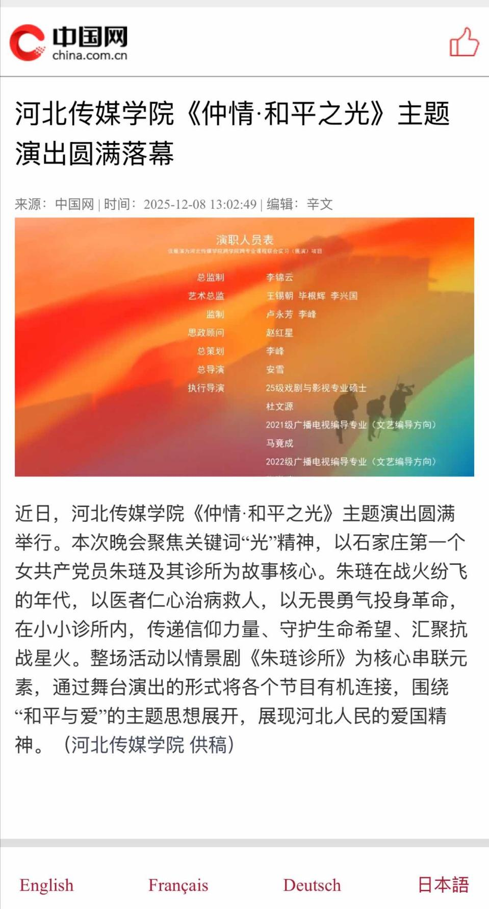 日前,河北传媒学院跨学院跨专业课程联合实习项目《仲情·和平之光》创演晚会,在中国网独家播出。该项目由教务处牵头,影视艺术学院承办,集合各二级学院不同专业课程,省级教学团队“跨专业课程联合实践教学团队”进行指导。经过多年教学与创作实践,该项目已从校内舞台走向社会舞台,逐渐形成“仲情+”的品牌创演晚会。