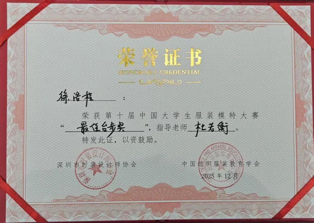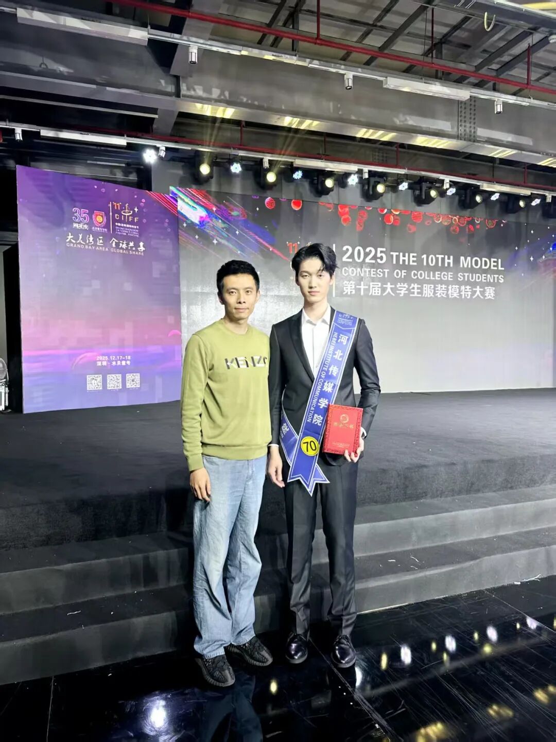 近日,河北传媒学院美术与设计学院表演(服装设计与表演)专业三年级学生徐浩程,在第十届中国大学生模特大赛全国总决赛中历经平面拍摄、专业理论测试及泳装、礼服等环节比拼,最终荣获最佳台步奖,教师杜若衡获优秀指导教师奖。