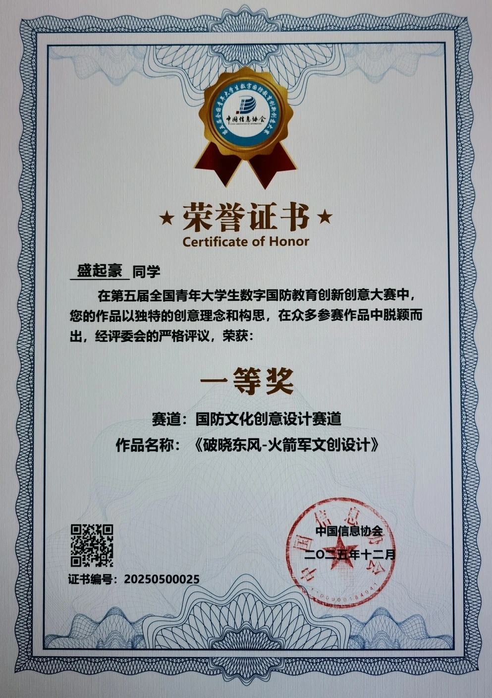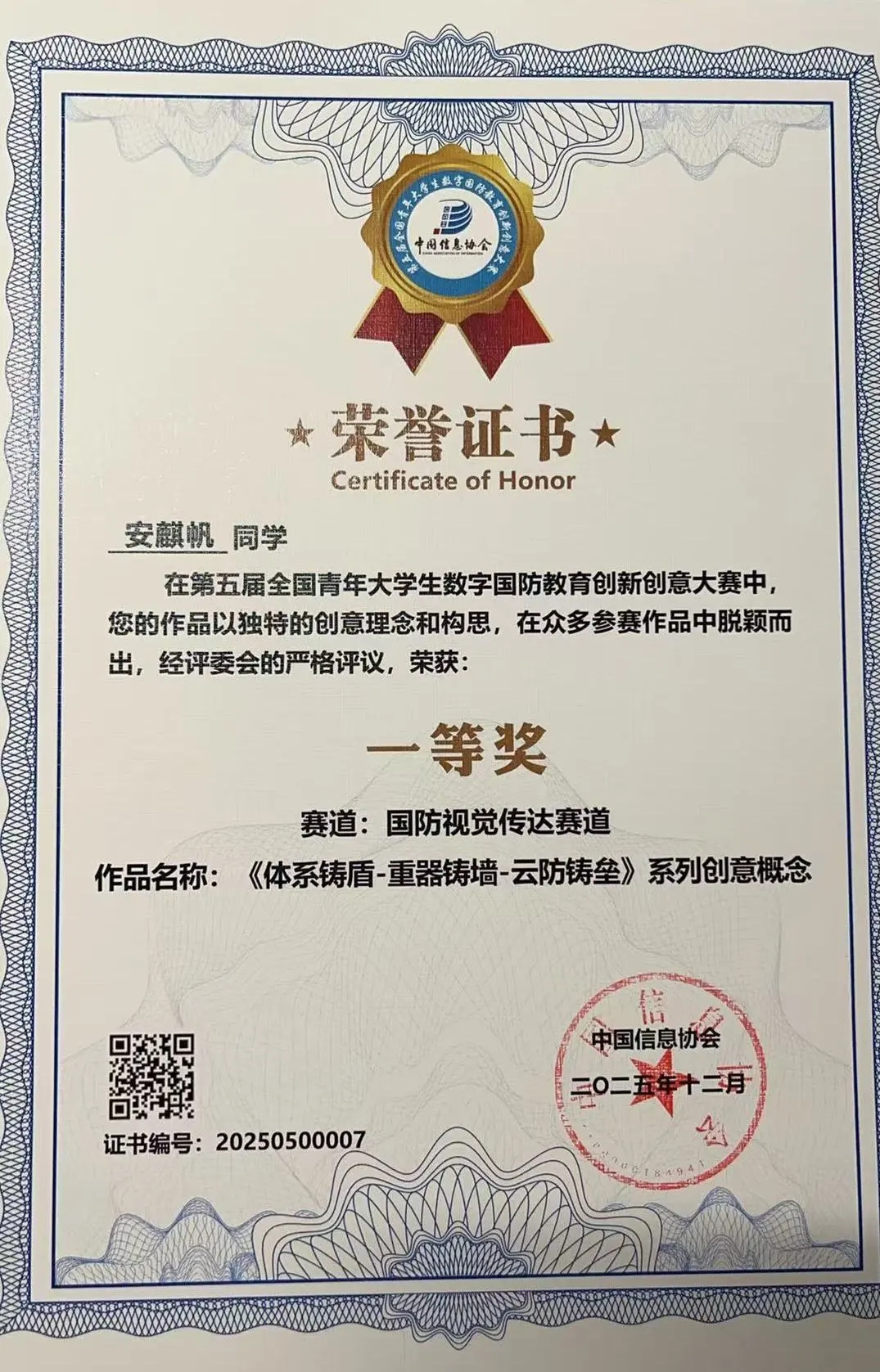 本次获奖是视觉传达设计专业将《信息可视化设计》课程实践与大型赛事和国防教育深度融合的成果,彰显了课程思政与项目式教学相结合的育人成效,也体现了课程在培养学生创新能力与家国情怀中的重要作用。