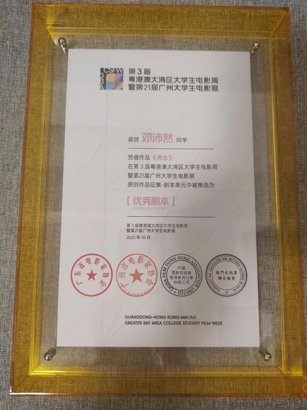 我校学生作品斩获“第3届粤港澳大湾区大学生电影周暨第21届广州大学生电影展”优秀剧本奖
