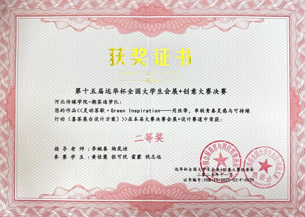 11月7日至9日,第十五届“远华杯”全国大学生会展+创意大赛决赛在广州清远成功举办。作为全国会展专业领域极具影响力的赛事,本届大赛吸引了来自全国87所高校的464支队伍同台竞技,并最终筛选出113支队伍晋级决赛。我校学生凭借出色的综合表现在决赛中斩获多项荣誉:河北传媒学院获教学成果一等奖,“新星之火队”《首届河北文化旅游博览会》、“星河队”《第二十三届中国玩具展》摘得一等奖,其余队伍斩获二等奖5项。